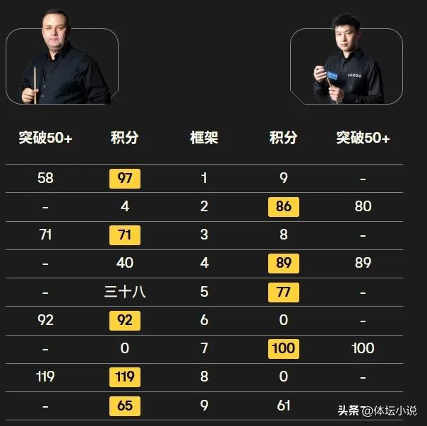 比赛开始后,上半场前四局两人势均力敌,四杆全部都是单杆50+,2-2握手言和。第五局比赛节奏变慢,赵心童零敲碎打以77-38拿下。马奎尔紧追不舍,单杆92分,3-3追平比分,第七局赵心童单杆破百零封以4-3拿到赛点。第八局马奎尔还以颜色单杆破百零封追平比分。决胜局非常离谱,赵心童一度61-12领先,但是没有想到却连续失误,进攻时还将贴库红球以及黑球盘活了,真的是莫名其妙,让马奎尔利用防守清台完成极限绝杀,硬生生的给逆转了!