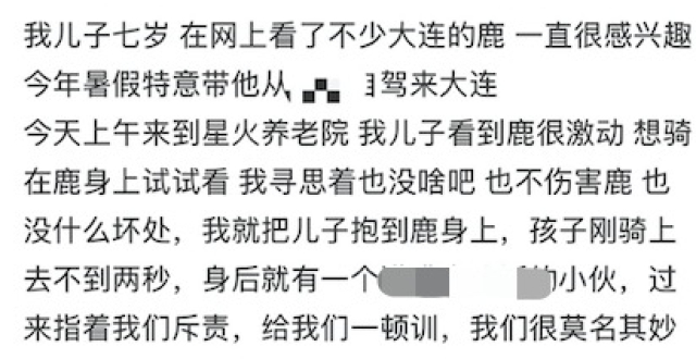 “小孩儿骑一下也没啥吧,我们骑不骑和你有啥关系?”8月13日,一名外地游客在小红书上发文“自曝”称,她带儿子来到西岗区星火街附近观赏梅花鹿,期间将孩子抱起放到鹿身上骑乘,被周围市民制止,并认为制止者“多管闲事”。文章一经发出,众多网友纷纷指责这名游客“没常识”。此前,我市曾发布《致大连市民及游客朋友们的一封信》,其中提出倡议,观赏梅花鹿时应避免近距离接触。让孩子骑乘梅花鹿遭制止近年来,大连山林中有梅花鹿出没,且鹿群规模不断壮大,逐渐成为滨城一道独特的风景,吸引不少市民游客慕“鹿”而来观赏,但人与鹿和谐共处的“乐章”中,有时也会出现些许不协调的“杂音”。8月13日,一名游客在小红书上发文称,今年暑假,她特意带着7岁的儿子从外地自驾来大连,前往西岗区星火街附近看鹿,孩子看到鹿很激动想骑一下,就把孩子抱到了鹿身上骑乘,但很快就被一名市民制止。记者看到,这名小红书平台用户认证为女性的游客,对此很不满意。文章中充斥着“我寻思着也没啥吧,也不伤害鹿也没什么坏处”“我们骑不骑鹿和你有啥关系?用得着你管吗?哪个规定写了鹿不让骑?”等表述。众多网友指责涉事者“没常识”记者注意到,这篇文章在8月13日晚上8点32分发布后,迅速引起众多网友关注,截至8月14日上午,已有近千条评论,大家纷纷指责这名带娃游客“没常识”“太气人”。有网友说,“你咋就肯定骑乘行为对鹿没伤害呢?7岁大的小子也有几十斤重了,把鹿腰背坐坏了怎么办?”有网友表示,“还说哪个规定写了鹿不让骑,深山老林里的老虎你咋不去骑呢?”记者通过平台私信联系这名游客,表明记者身份并要求核实相关情况的真实性,但截至发稿前,没有收到回复。骑鹿行为可能对鹿对人均有危害对此,中国绿发会梅花鹿保护地大连负责人陈亮表示,游客与在野外生活的梅花鹿密切接触,并认为“没啥事儿”是一种错误认知。首先,生活在野外的梅花鹿身上会携带细菌和蜱虫,而8月份正是蜱虫活跃期,每年护鹿志愿者都会在做好防护的情况下为鹿清理蜱虫。“游客与梅花鹿亲密接触后被蜱虫叮咬的事件时有发生,许多缺乏相关知识的游客处理不当,比如直接拉扯蜱虫导致其口器残留体内,可能引发感染,情况严重甚至危及生命。”陈亮表示,儿童免疫力较成人更低,大人带孩子观赏梅花鹿时更应该注意时刻与鹿保持距离。其次,大连山林中的梅花鹿未经过人工驯养,仍具有野性,游客贸然做出如“骑乘”一类的行为,容易让鹿感到不安,进而产生应激反应。一旦鹿受惊后出现攻击性,人可能被鹿踢伤或被鹿角划伤,鹿可能因慌乱而在山林中摔伤,对人对鹿都可能会造成危害。赏鹿应保持安全距离今年8月8日,我市曾发布《呦呦鹿鸣,滨城共生——致大连市民及游客朋友们的一封信》。信中表示,随着鹿的种群数量增加、活动范围增大以及社会关注度的上升,人类与这些梅花鹿接触越来越多,愈发亲密。其中,一些行为无形中对梅花鹿造成不同程度的影响甚至伤害。因此,信中对市民游客发出三点倡议。其一,不要擅自投喂。梅花鹿食物以青草、树叶为主,其他食物吃多了易引起消化不良,特别是人们投喂的食物品类较杂时风险更大。另外,投喂食物的塑料袋、包装纸也容易被误食,导致严重的消化系统疾病,甚至会危及生命。其二,避免近距离接触。野外生活的梅花鹿身上会有蜱虫和细菌,同时人身上也可能携带导致梅花鹿生病的病毒。近距离接触不仅威胁个人健康,也会让鹿群感到不安,彼此带来健康风险。另外,如长期的接触,会让梅花鹿降低对人类的警惕性,逐渐丧失野性,导致它进入人们的生活区域,增加意外事故发生的可能性,尤其是交通要道和居民区,极易引发交通事故或伤害事件。其三,不要伤害梅花鹿。梅花鹿平时在跑跳时,鹿角会碰出点小伤,但这些都是自然现象,无需人为干预。但故意伤害它们,特别是不法分子盗割、故意伤害鹿茸、鹿角等行为,会面临法律法规的严惩。来源:半岛晨报、39度视频